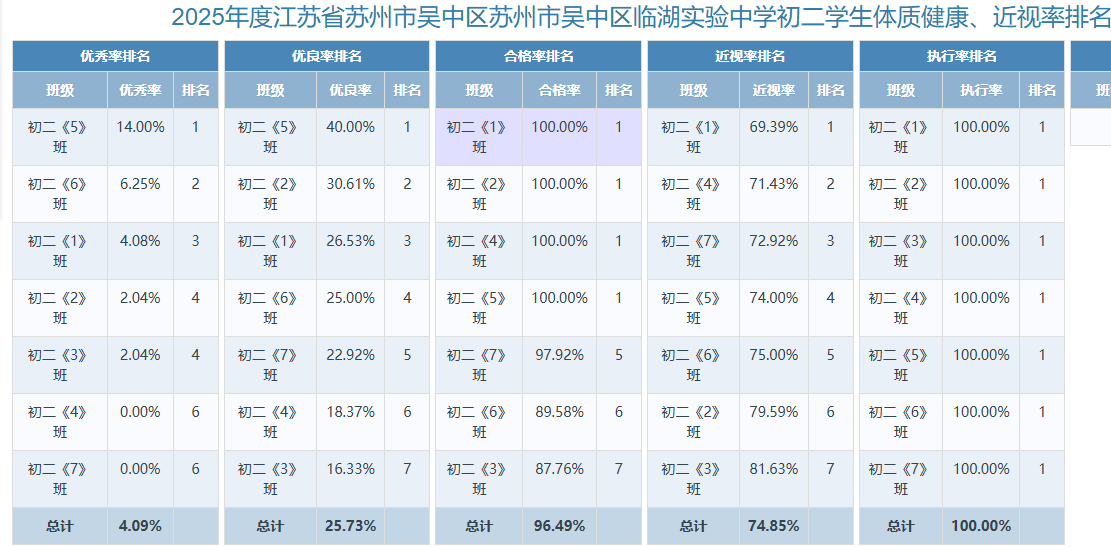 2025年度江苏省苏州市吴中区苏州市吴中区临湖实验中学学生体质健康、近视率排名